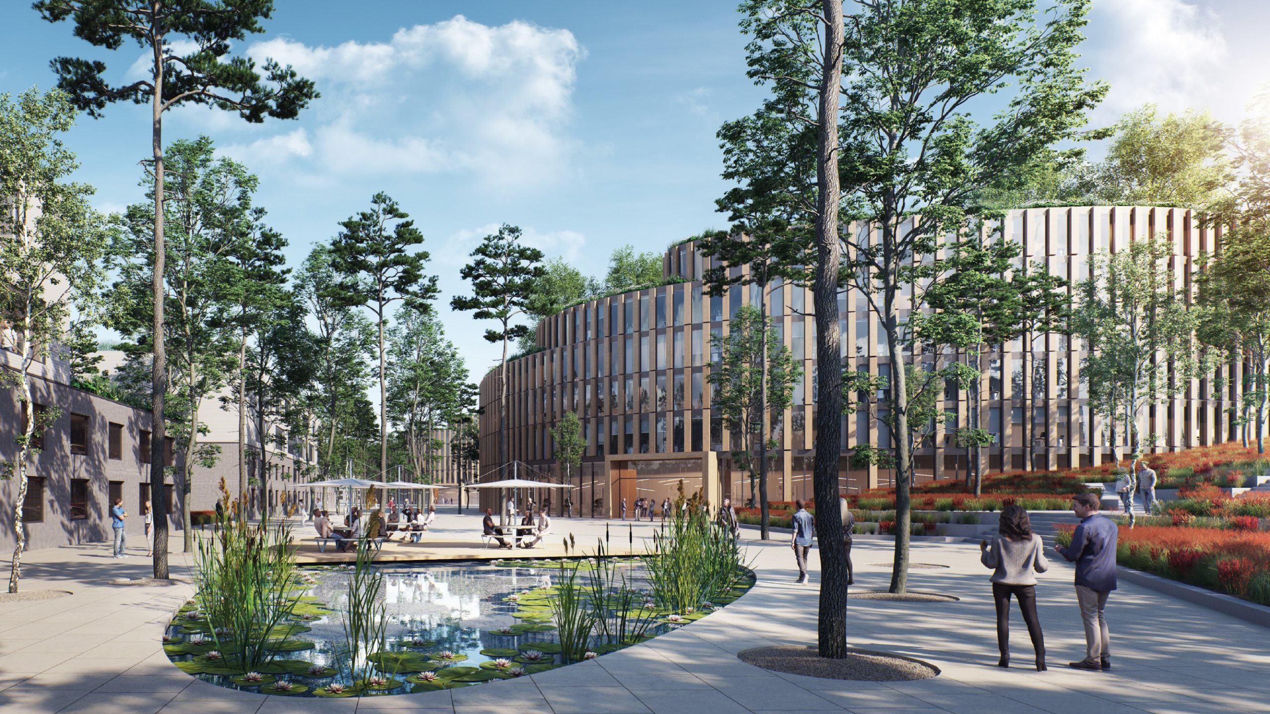 Das städtebauliche Konzept gliedert sich dabei im Wesentlichen in zwei Zonen: Im Norden prägt die freie Anordnung von organischen Gebäudeformen einen geschwungenen Bogen bis zum Hochpunkt den neuen Waldcampus. Die Gebäude fügen sich sanft in den Wald und die Topografie des Hanges ein. Im Süden entsteht ein städtebauliches Rückgrat für den Campus, das mit seiner klaren Formensprache einen gelungenen Übergang zur Bestandsbebauung schafft. Zwischen den beiden Zonen bildet eine Freiraumachse, die sich an drei Stellen als gemeinsame Mitte zu Platzsituationen aufweitet, das Herz des neuen Campus.