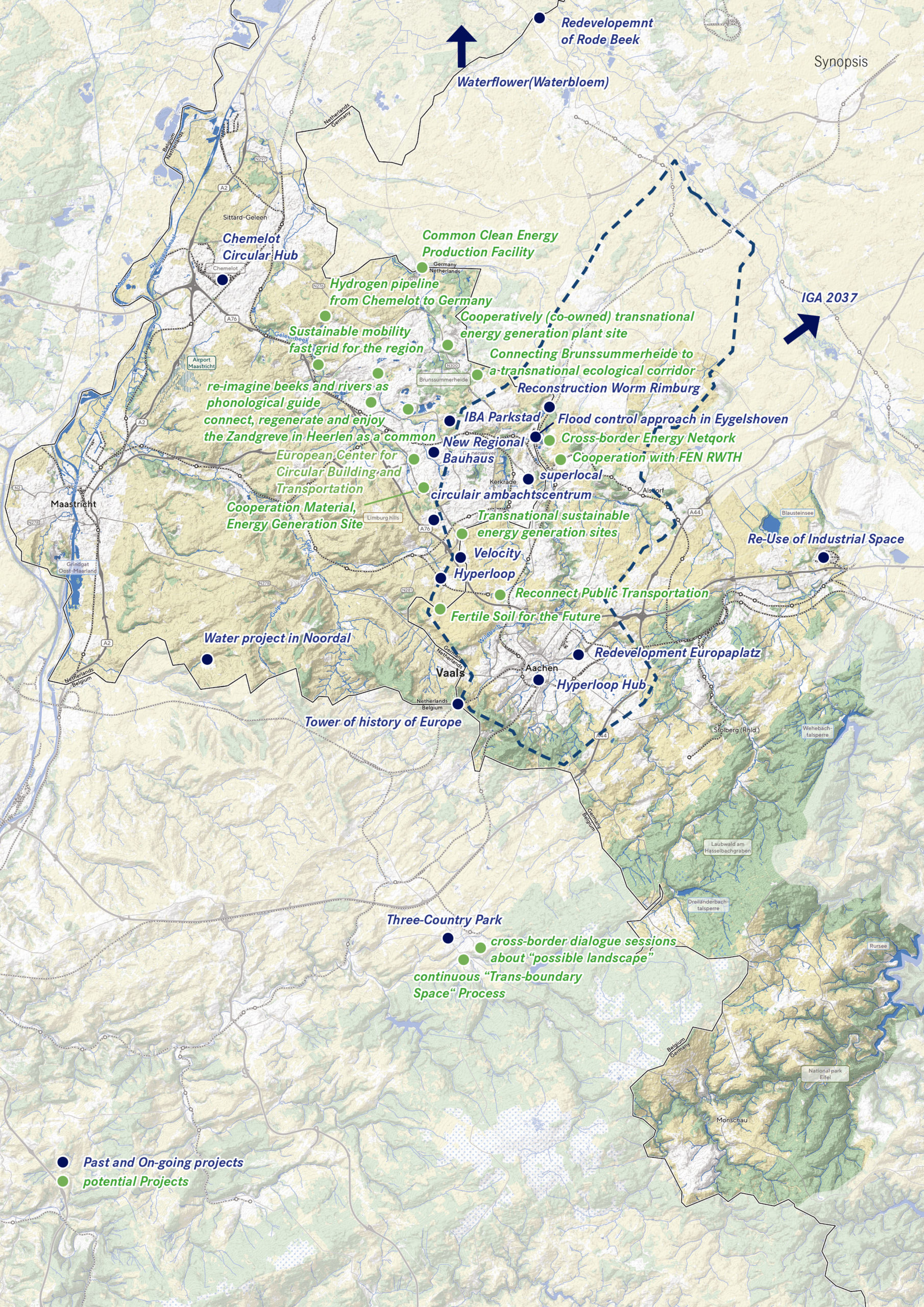 Das im kollaborativen Prozess erarbeitete Manifest „From Mining to Harvesting“ formuliert Leitsätze für gemeinsame Ziele und Werte für die Zukunft der Rhein Maas-Region. Das Manifest wurde im Rahmen eines kooperativen Planungsprozesses mit verschiedenen aufeinander aufbauenden Beteiligungsformaten entwickelt. Im Laufe des mehrtägigen Workshops wurde auch eine Bestandsaufnahme der bisherigen und laufenden räumlichen Projekte in der Region durchgeführt und Bereiche identifiziert, in denen eine Zusammenarbeit unerlässlich ist. Diese Projekte sind zugleich eine offene Einladung, Aktionen und Kooperationen zu initiieren, die die Visionen und Verpflichtungen des Manifests für eine gemeinsame Zukunft der Region räumlich umsetzen.
